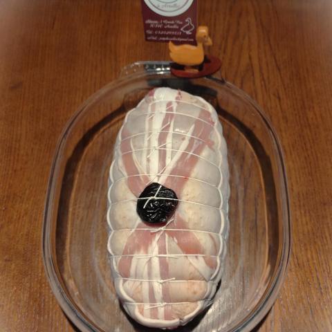 Roti de chapon, agrémenté d'une farce composé de viande de volaille, viande de porc et de morceaux de foie gras. Le tout enrobé de poitrine de porc fumé.