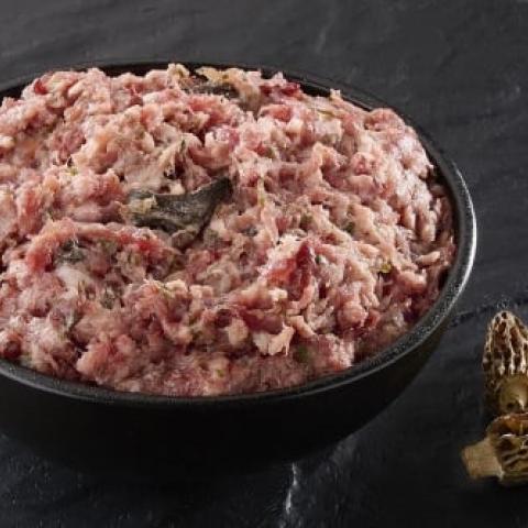 Farce composé de viande et abat de volaille, viande de porc et de morceaux de morilles, le tout assaisonné. Conditionné sous vide.