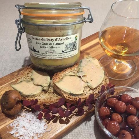 Foie gras issu de canard mulard, gavé 12 jours à la ferme, exclusivement au maïs grain. Le foie gras mi-cuit est un foie gras pasteurisé.